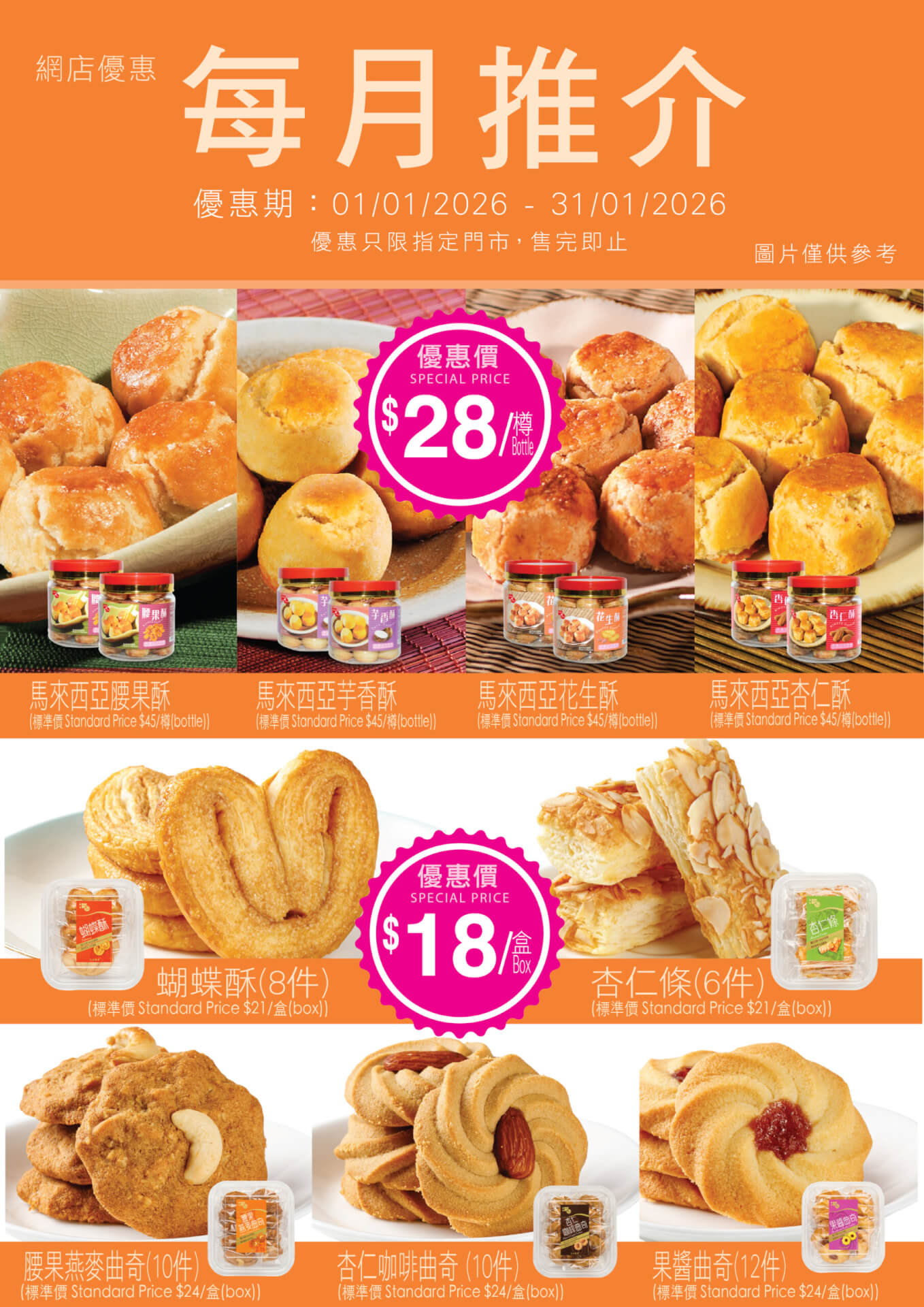 | 馬來西亞杏仁酥 | $28/樽 | $45/樽 |